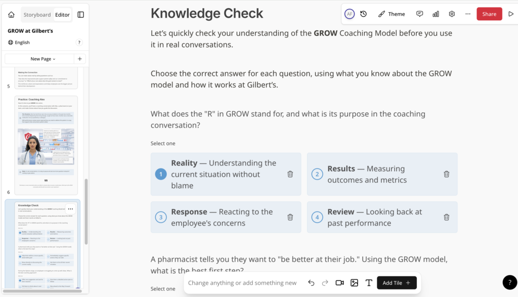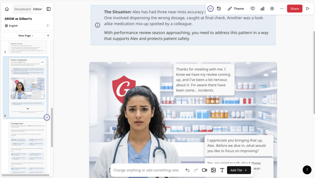 I designed a short Mindsmith lesson where leaders meet Alex, a pharmacist with several recent near‑miss accuracy incidents during busy shifts, and practise coaching them using the GROW model. The experience blends concise explainer screens, interactive tiles, and a branching coaching scenario, followed by a focused knowledge check that reinforces how GROW looks in real conversations at Gilbert’s.
