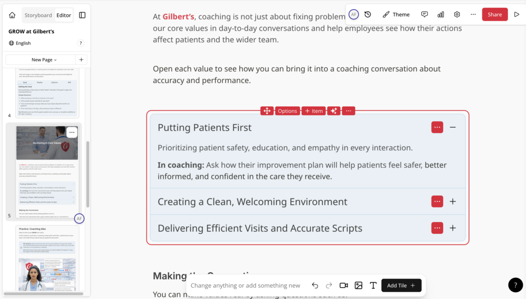 I used Mindsmith’s storyboard feature and AI assistant to generate an initial outline mapped to the GROW stages and key leader‑guide points, then iterated on the sequence, tile choices, and copy to better fit Gilbert’s context. I uploaded the Gilbert’s Pharmacy Core Values and Gilbert’s GROW Coaching Guide PDFs into Mindsmith so the AI‑generated storyboard, scenarios, and feedback language stayed tightly aligned with Gilbert’s culture and examples. I also used Perplexity to review and refine interaction choices, feedback wording, and reflection prompts, treating it as a design partner while keeping final instructional decisions grounded in the brief. From there, I refined the flow and copy manually, using a Mindsmith library character for the Alex scenario and Manus‑generated backgrounds and imagery to reinforce the values focus without overwhelming the coaching conversation.