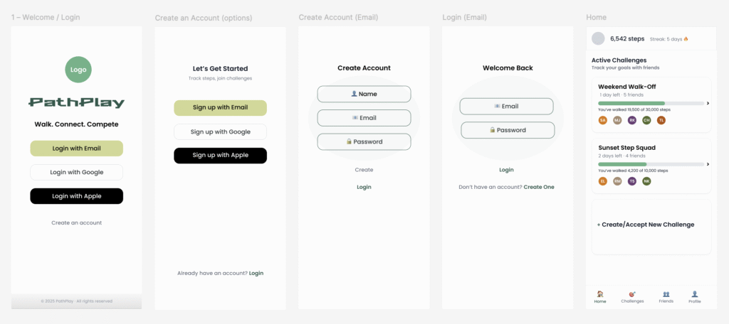 The authentication flow includes clean welcome screens with multiple sign-up options and consistent branding. The “Walk. Connect. Compete” tagline immediately communicates the app’s social focus. The home dashboard balances personal progress with social elements, showing step counts, active challenges, and friend activity in a single view that encourages both individual achievement and community engagement.