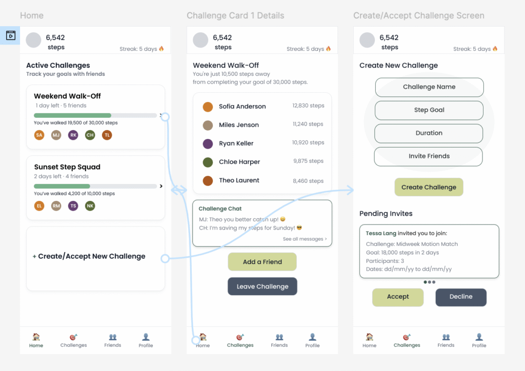All screens optimize for mobile-first design with interactive elements meeting accessibility standards. Consistent design tokens for colors, spacing, and typography create maintainable interface patterns, while components like challenge cards and friend lists adapt to different content lengths.