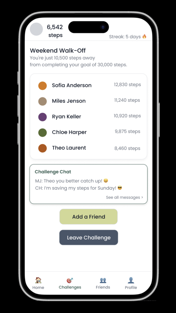 As a design exploration, I identified an opportunity to reimagine how fitness apps could better support user engagement through social connection. While many existing fitness apps emphasize individual metrics and achievements, this concept investigates how community-driven features might create more sustainable motivation for daily walking.