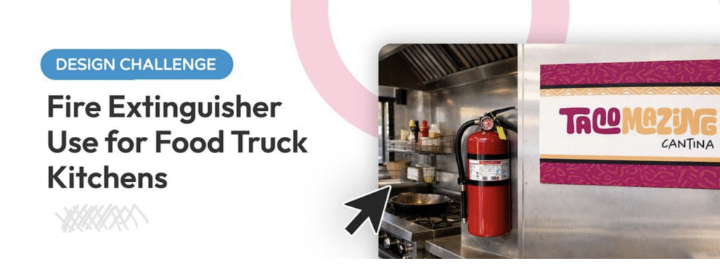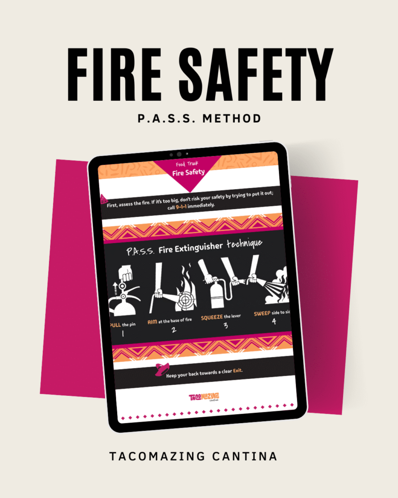 Kitchen fires in food trucks spread rapidly, leaving workers with mere seconds to respond. Tacomazing Cantina needed a job aid that employees could reference quickly during high-pressure emergencies, something clear enough to read from a distance while following the P.A.S.S. fire extinguisher method.